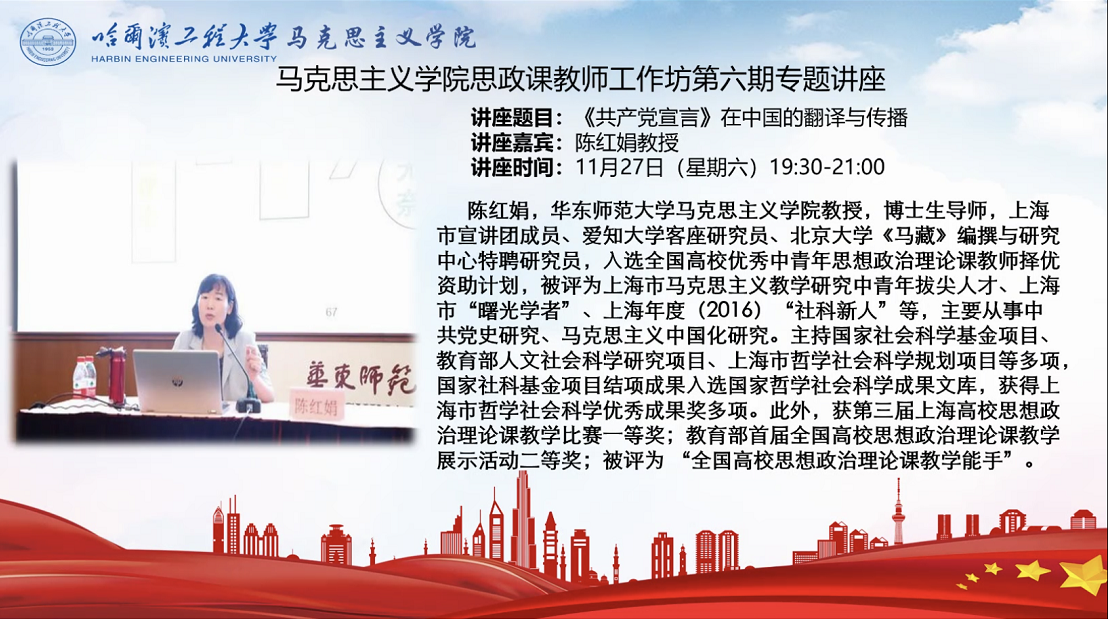 2021年11月27日,我院邀请华东师范大学太阳成城集团tyc234cc博士生导师、上海市宣讲团成员陈红娟教授作为主讲嘉宾,以“《共产党宣言》在中国的翻译与传播”为题作讲座。讲座由太阳成城集团tyc234cc科研副院长李世辉主持,全院师生参加本次讲座。