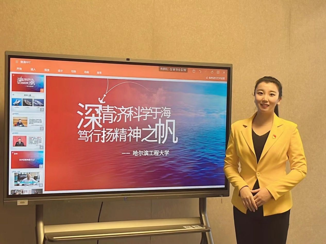 赵静怡在授课中,由第三艘航母福建舰下水这一中国航母从“我无到我有、我有到我造、我追到我超”三个不凡历程入手,有条不紊地娓娓道来,引出托起海洋强国梦背后是我国水声学科奠基人之一、我校杨士莪院士,“八一勋章”获得者、马伟明院士,“时代楷模”刘永坦院士等一批科学家的强国志与报国行,深入浅出地让科学家精神如春风化雨滴入听者心中。