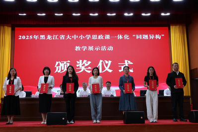 开班式上,雒文虎为2025年黑龙江省大中小学思政课一体化“同题异构”教学展示活动的获奖团队代表颁发获奖证书。我校牵头组建的大中小学思政课一体化教学团队讲授的“肩负龙江担当 守好中国大粮仓”课程获得一等奖(第一名),并进行了现场教学展示,生动呈现了我校在大中小学思政课一体化“同题异构”教学设计等方面探索创新的成果。
